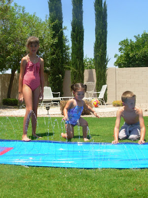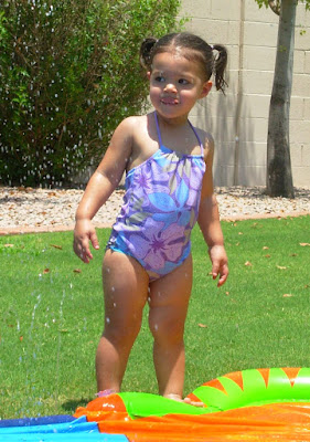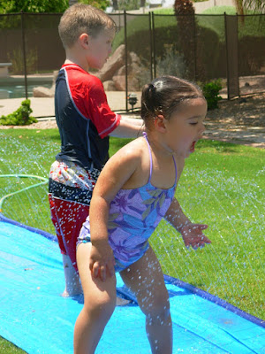 We set up a slip and slide we found in our Grammy's trunk in the backyard to entertain the kids while we BBQ'ed. Then, we ate and enjoyed the pool. The water was so WARM - - it was almost not refreshing it was that warm. Alas, we all had a great time!! Kaiya had a blast swimming in the pool and showing off all her great skills.