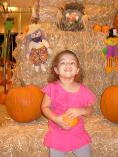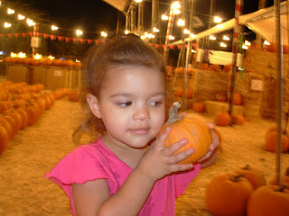 Kaiya got to pick her own pumpkin. I thought she would pick a big one. However, she picked on just her size. Prasan did everything he could to get her to pick a different pumpkin. So, here she is with her little pumpkin! She loves it!