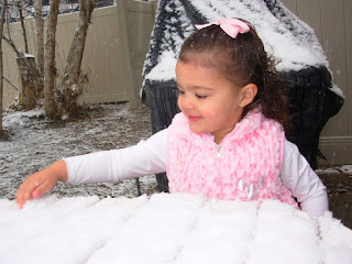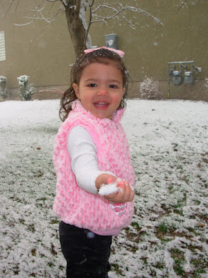 The first morning that it snowed, Kaiya slept till pretty late. We were at our cousin Meg, Scott, and Spenny's house. When she woke up, I said, "look outside, what do you see?" Her response was, "SNOW! It SNOWING. LET'S GO FEEL IT!!" Ok, I loved that response! She was so excited about it and wanted to FEEL IT!! We quickly got dressed, got breakfast in our tummy, and headed into the snow!! After a few minutes in the snow she said, "Mom, my hands melting." How cute! She really meant freezing! So, we ran inside!