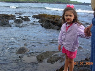 While checking out the sand we discovered another sea turtle sunning itself. So, we went back to see if Kaiya wanted to wake up to see the sea turtle! I am so glad she decided to wake up because in the wake of walking to see the sea turtle sleeping on the beach, we discovered TWO OTHER SEA TURTLE in the shallow rock pools right on shore! One was eating moss/sea week off the rock and the other was swimming!! We turned around to get off the rock only to discover a third and climbed on the beach right next to us without us even noticing! That was the coolest things for Kaiya to see them actually moving! We spent about 20 - 30 minutes there and hit the road again!