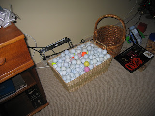 Not only does he find and collect the golf balls golfers are either too lazy to look for, but he enjoys trying to get everyone to count how many he has . . . M1 did a fabulous job of counting them for him. He also tries to beat his daily record! The record to date is 23 golf balls in one day found!!