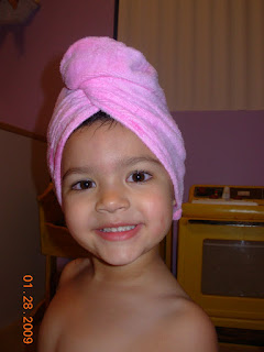 We also decide it was time to get a head turban to dry our hair! Here she is displaying her pink head turban like mom's! I do have to say . . . it doesn't dry as well as mine does . . . left me a little bummed!! OH well!!