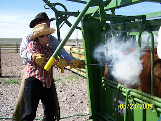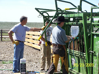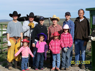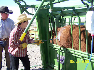 Saturday came, and my brother in Idaho Falls brought his family up to the ranch to assist. It took the entire family plus one hired hand 5 hours to "process" 240 head of cattle. My SIL and I pushed cows most of the day, with Grammy assisting. Granddad ran the head on the squeeze shoot, Uncle Colby immunized, Uncle Cary branded, and the ranch hand ear tagged. Grammy helped push cows, and then made a delicious and well deserved lunch.