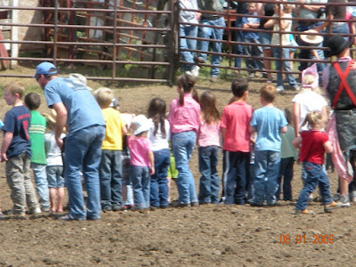 The Triple M cousins walked into the rodeo just in time! Every year, as a intermission, the tie a ribbon to the tail of a calf. The kids try to get the ribbon off the tail for a cash prize. This was the first year Kaiya particiapated! The consin walked in just as the announced the calf chasing! These few distant pictures are of the Triple Ms and Kaiya chasing the calf! We didn't get the ribbon this year, but they sure had fun! Every year, they come back saying next year they are wearing sneakers cause boots are too hard to run in!!