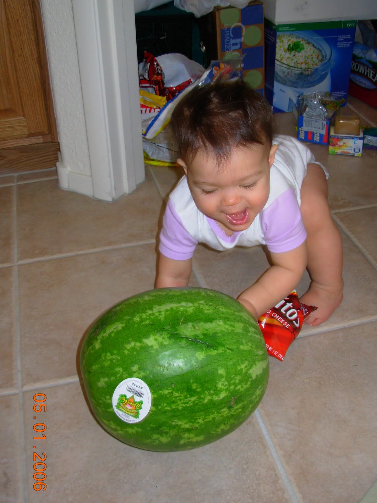 Watermelon or Ball? I had totally forgotten about kaiya finding a watermelon in our pantry, she proceeded to say "ball" and roll it!