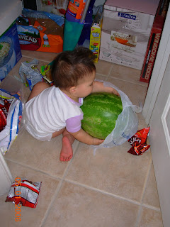 Your picture of the watermelon reminded me of a time when Lachlan was two and my friend at me just finished buying food for Girl's Camp. We were at her house and stepped into the kitchen. In the meantime Lachlan decided to throw all 4 watermelons down the stairs. Let's just say there was a huge mess to clean up!!
