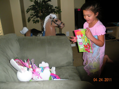 Hand me down Easter basket and her stash . . . not bad Mr. Bunny. Notice no candy . . . Bunny caught on that the kid never eats it . . . .